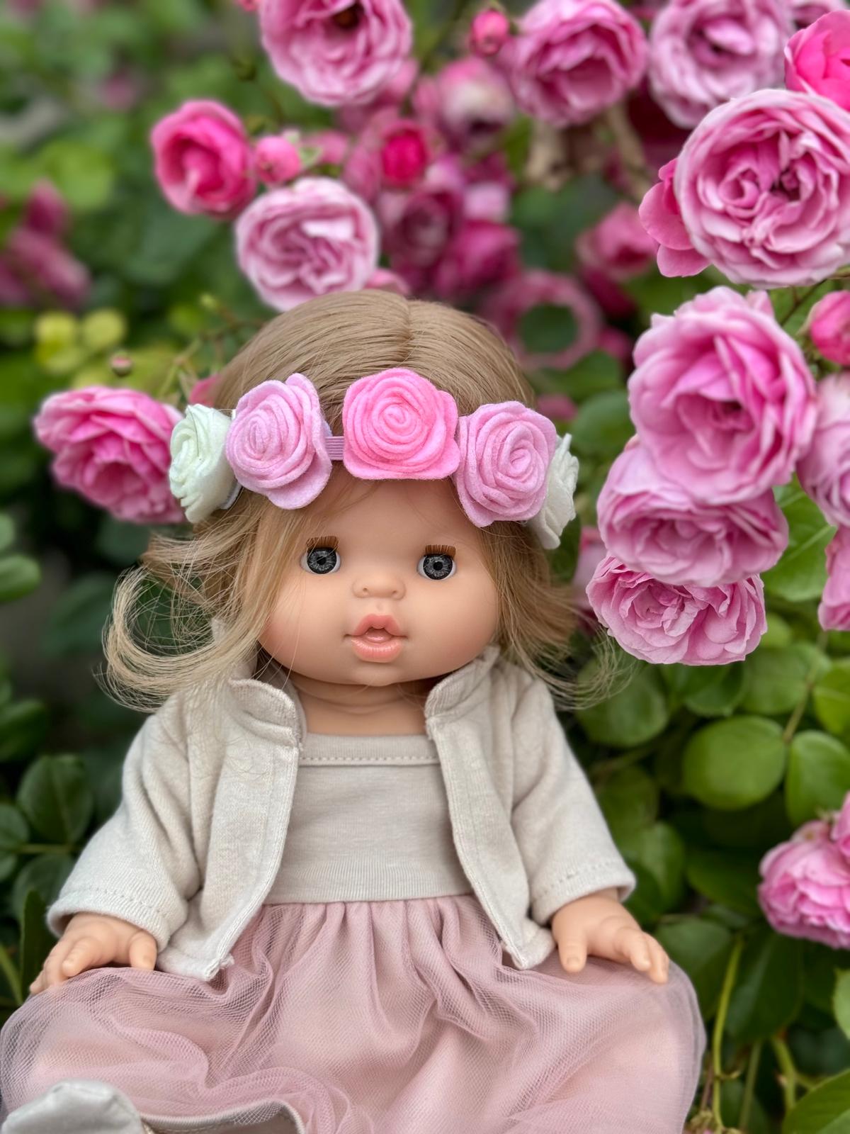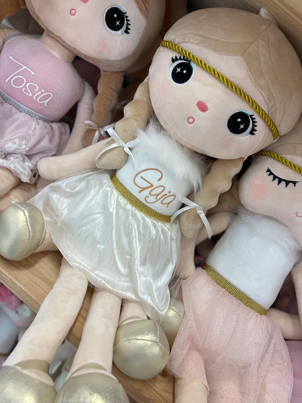 Na jej strój składa się tiulowa zdejmowana spódniczka, złote skrzydełka i balerinki, futrzany kołnierzyk i białe body. Laleczka wykonana jest z milutkiego pluszowego materiału.