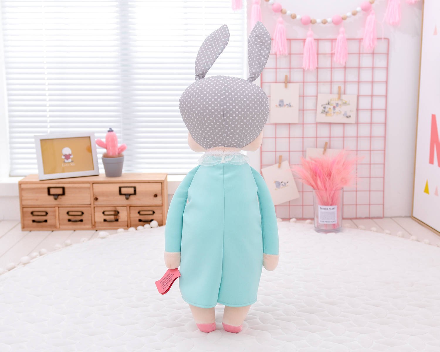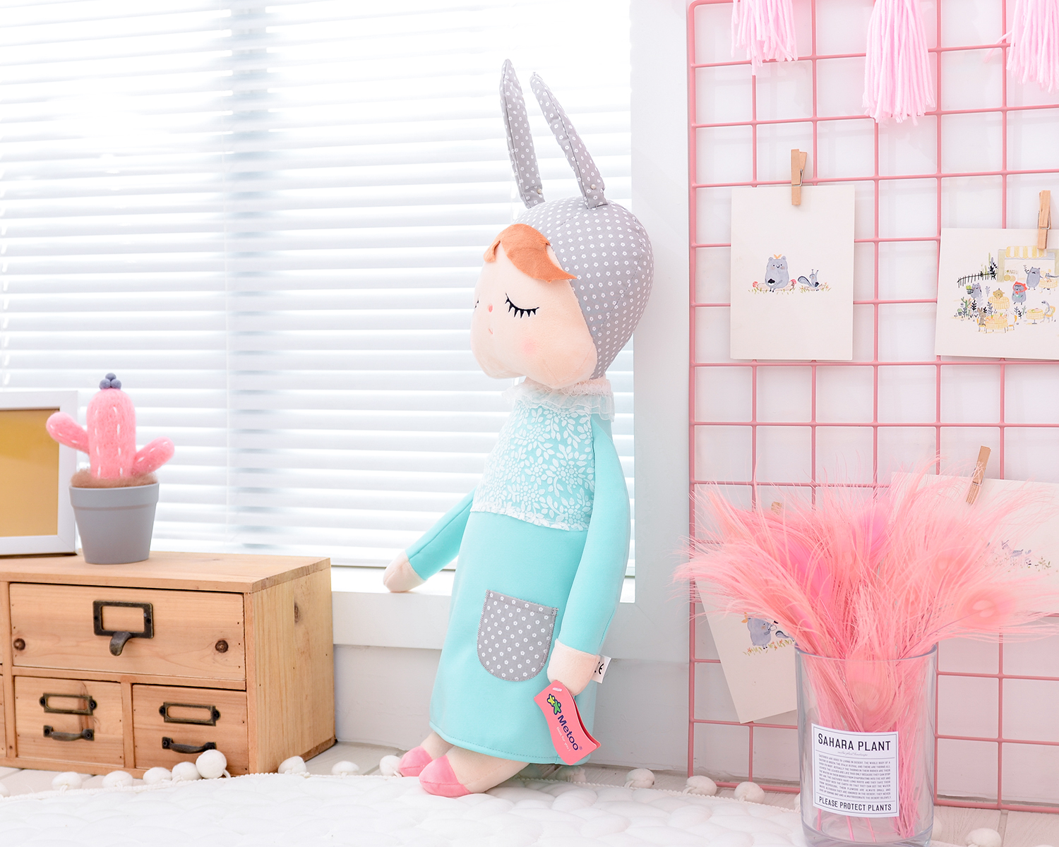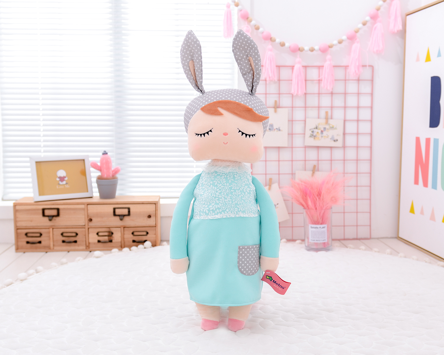 Śpiąca lala z uszkami w miętowej sukience to niewątpliwie  jeden z najpopularniejszych modeli Metoo w naszej ofercie! Zdobyła serca nie tylko dzieci, ale i rodziców na całym świecie. Jest obowiązkowym elementem pokoju dziecięcego w stylu skandynawskim. Wykonana z bezpiecznego i mięciutkiego materiału. Jest idealna do przytulania jak i do dekoracji.