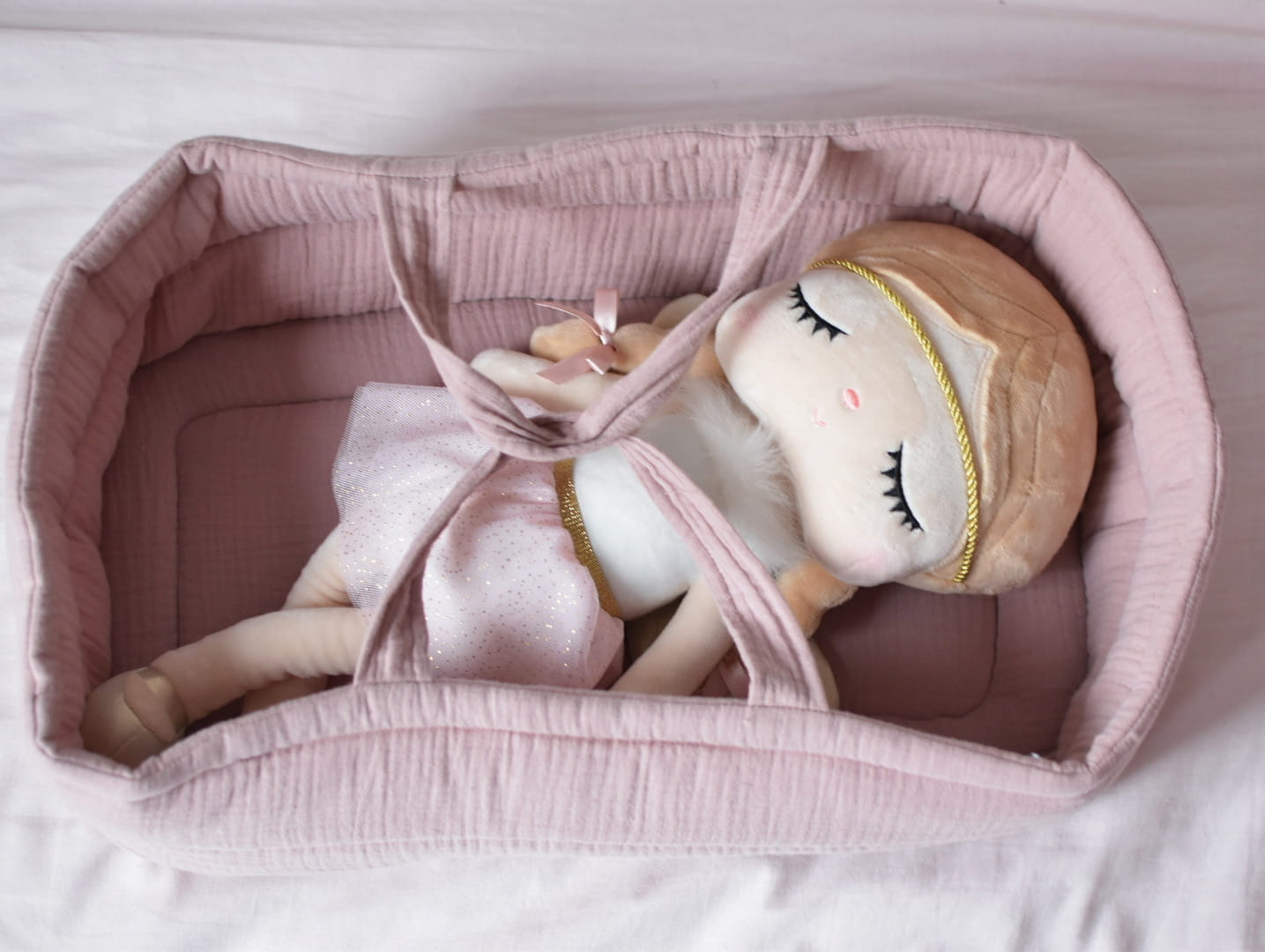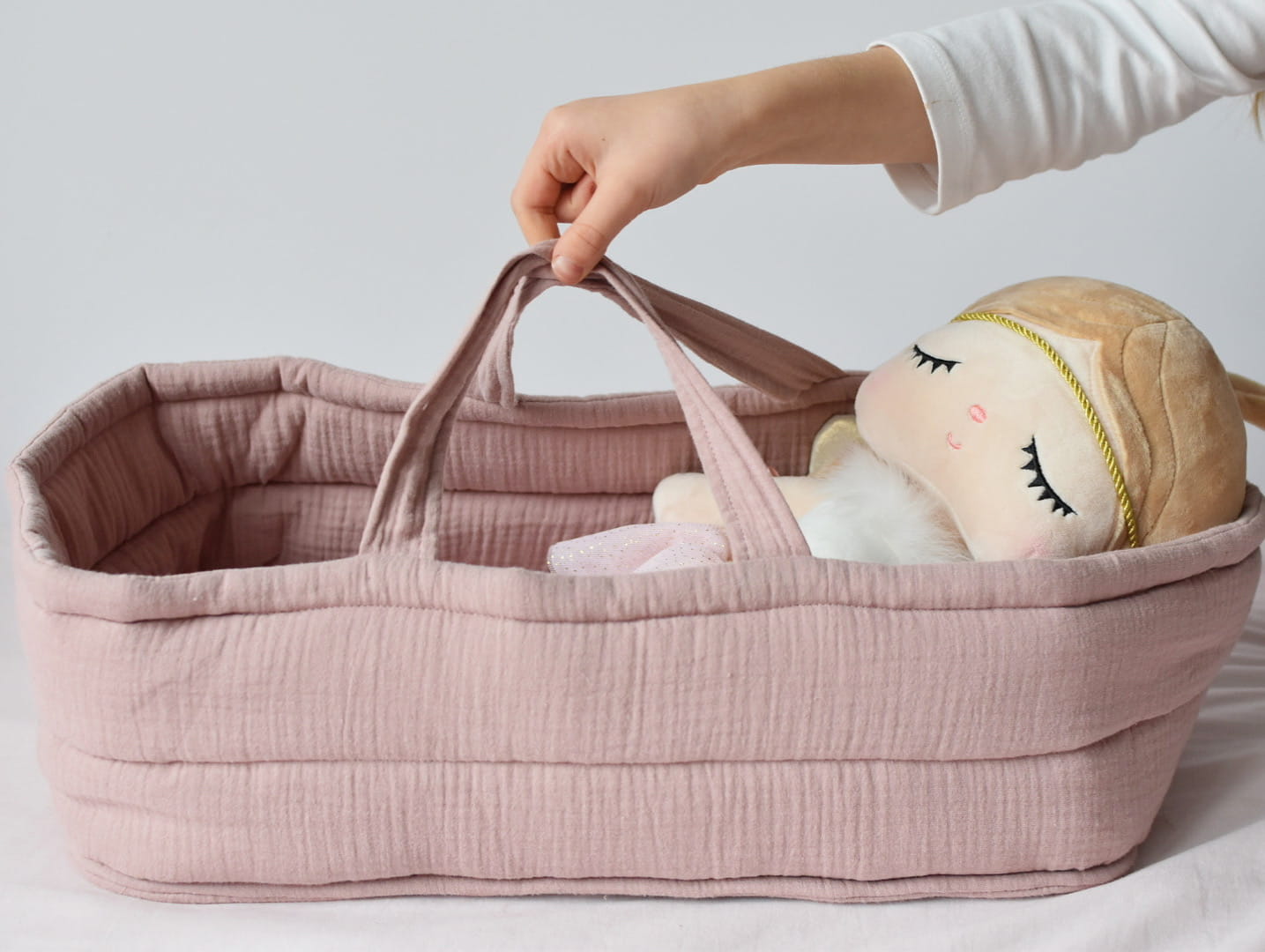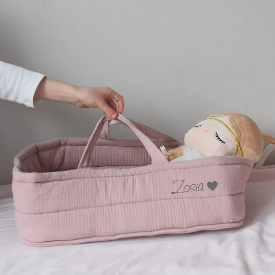Piękne nosidełko do zabawy dla dzieci, które jest niezastąpione dla większości lalek, zostało wykonane z delikatnej muślinowej tkaniny.