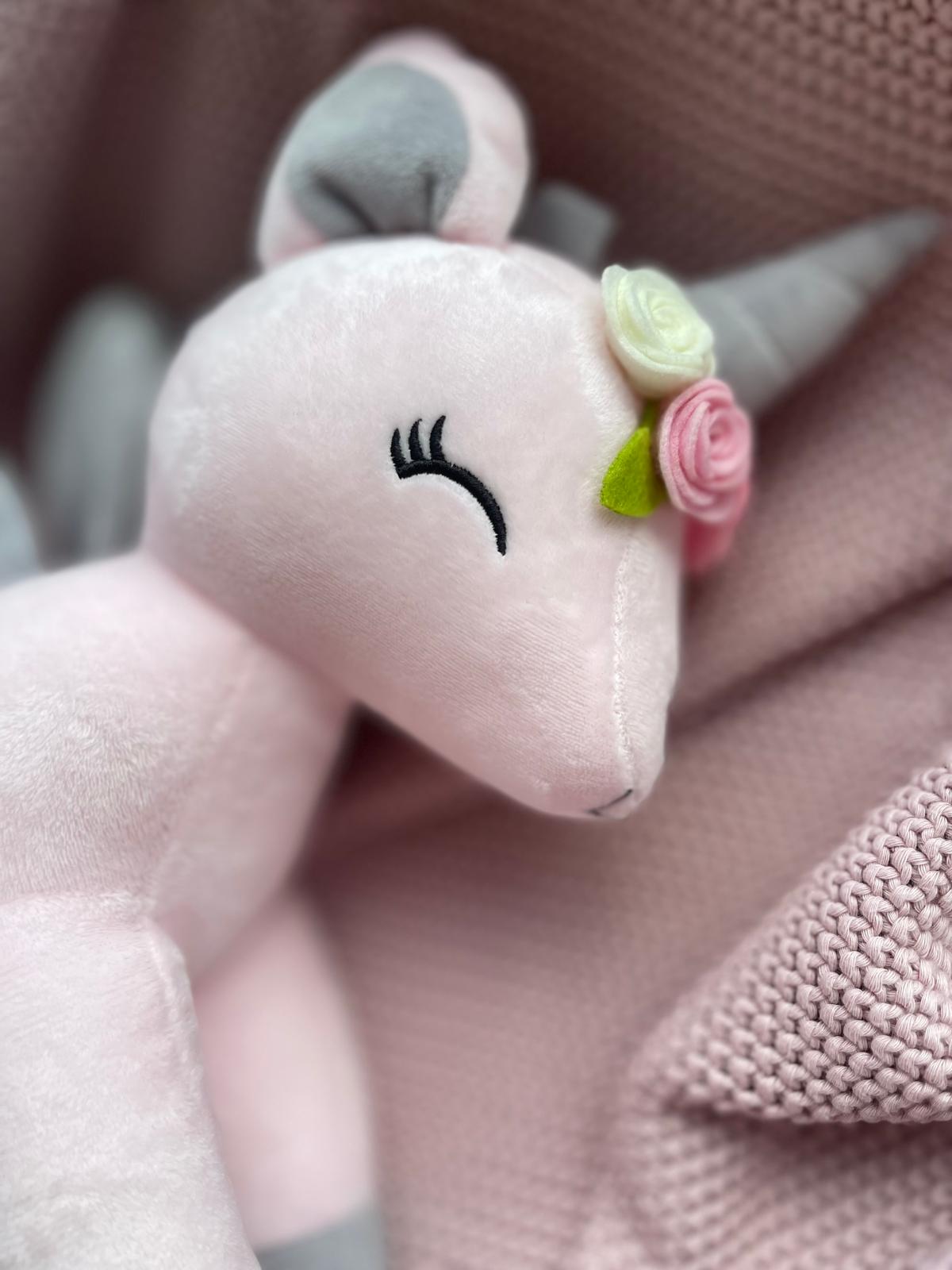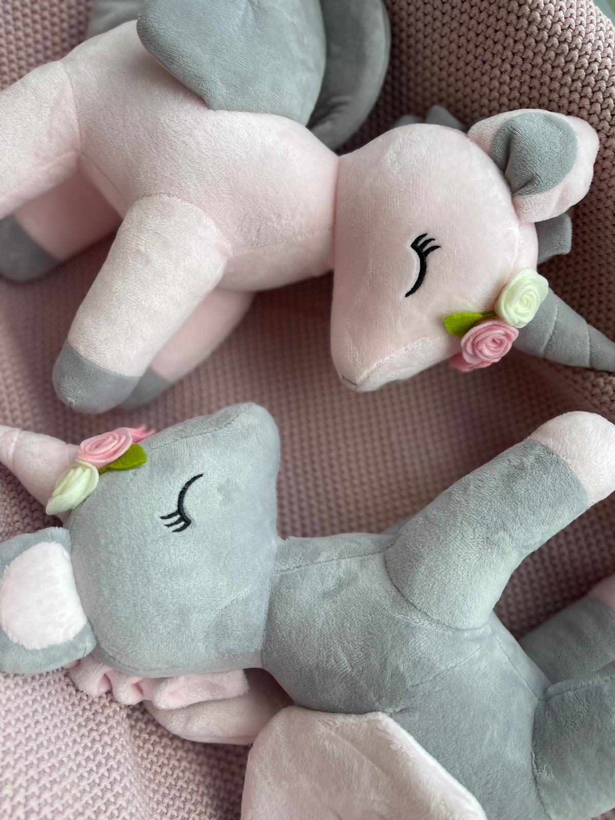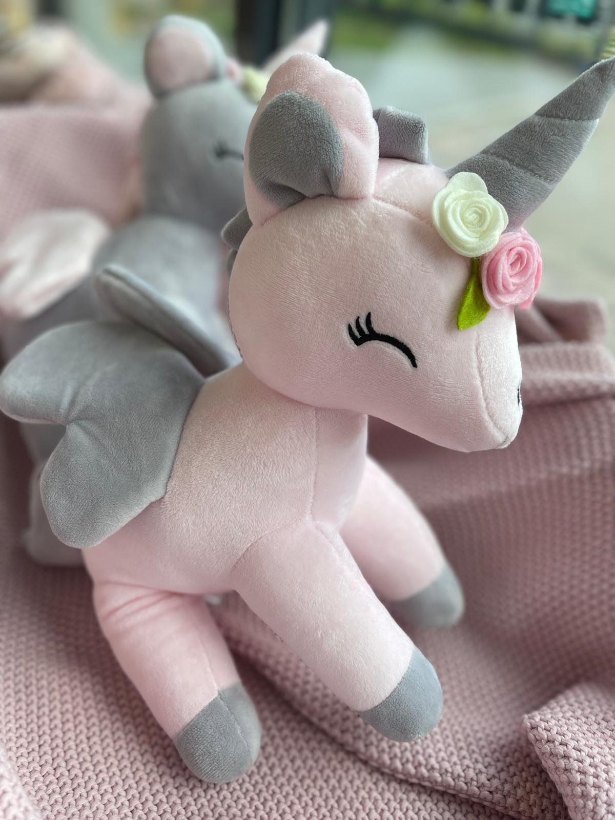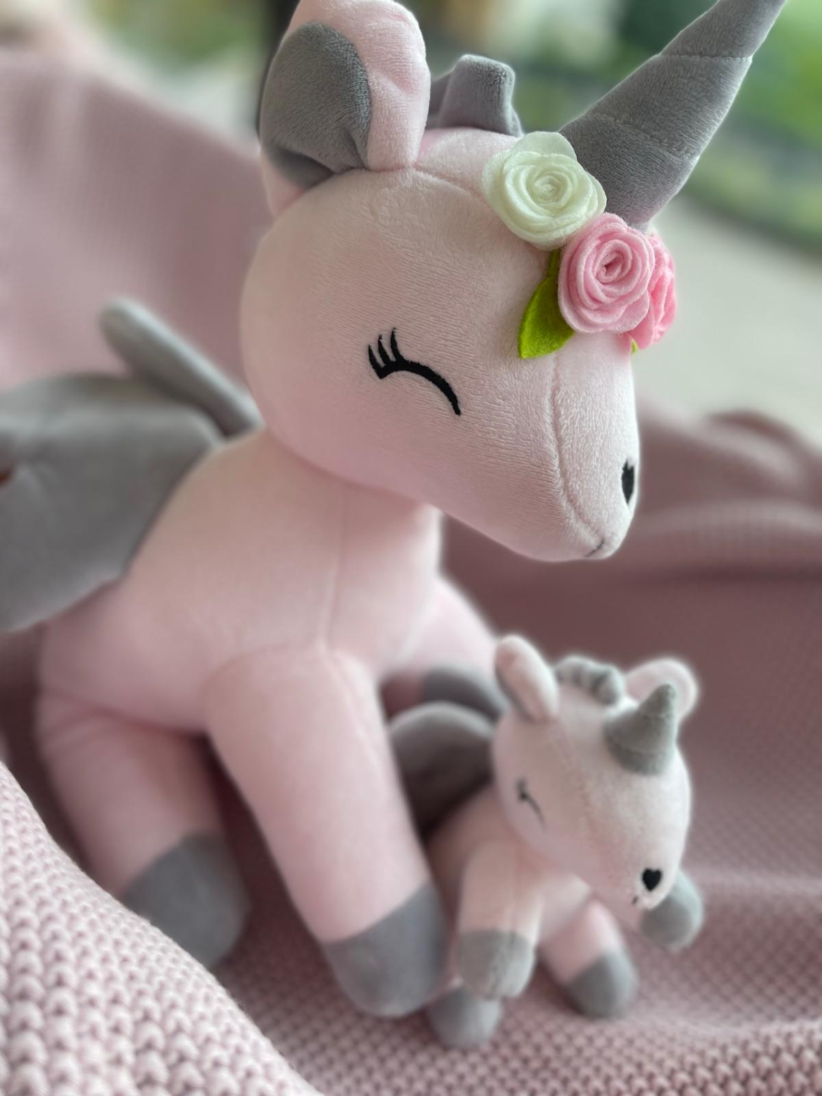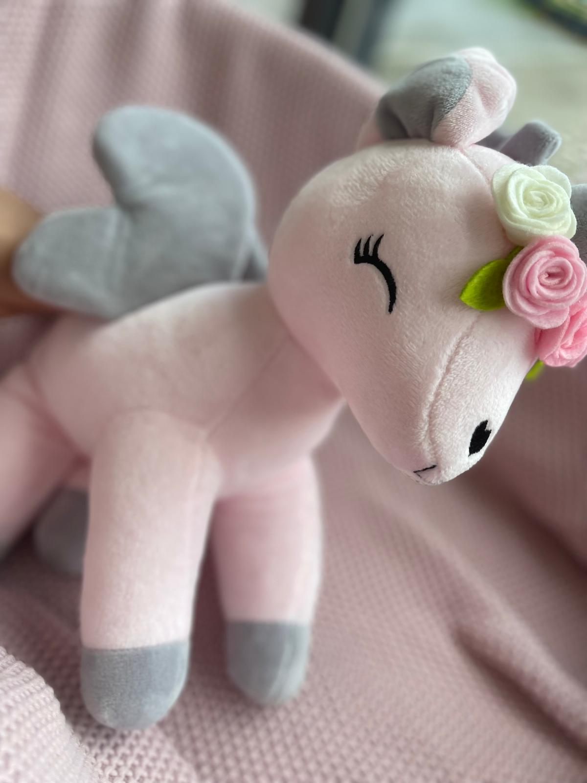 Przesłodki jednorożec z wianuszkiem w bajecznie pastelowych kolorach szybko stanie się ulubioną przytulanką na długie lata. Mięciutki i milutki materiał, skrzydełka i nosek w kształcie serduszka oraz „uśmiechnięte” oczka to znaki szczególne tej maskotki.
